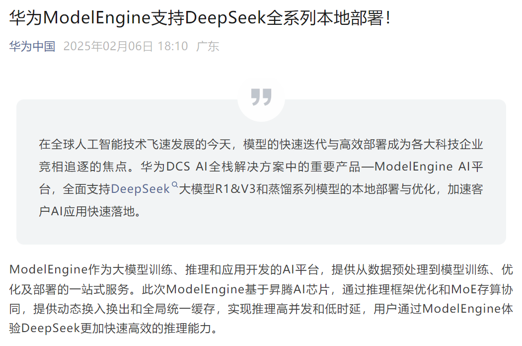 2月6日,华为中国宣布,华为DCS AI全栈解决方案中的重要产品—ModelEngine,全面支持DeepSeek大模型R1&V3和蒸馏系列模型的本地部署与优化,加速客户AI应用快速落地。