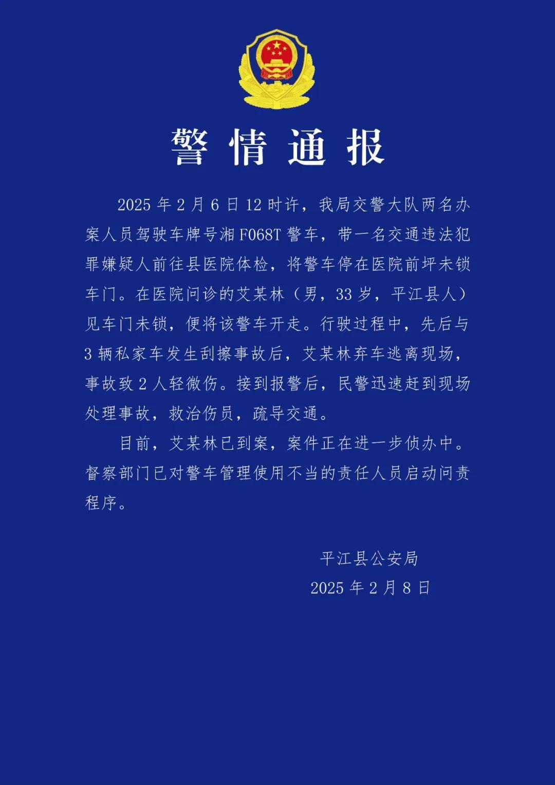 2月8日,湖南平江县公安局发布通报称:2月6日12时许,该局交警大队两名办案人员驾驶车牌号湘F068T警车,带一名交通违法犯罪嫌疑人前往县医院体检,将警车停在医院前坪未锁车门。在医院问诊的艾某林(男,31岁,平江县人)见车门未锁,便将该警车开走。行驶过程中,先后与3辆私家车发生刮擦事故后,艾某林弃车逃离现场,事故致2人轻微伤。接到报警后,民警迅速赶到现场处理事故,救治伤员,疏导交通。