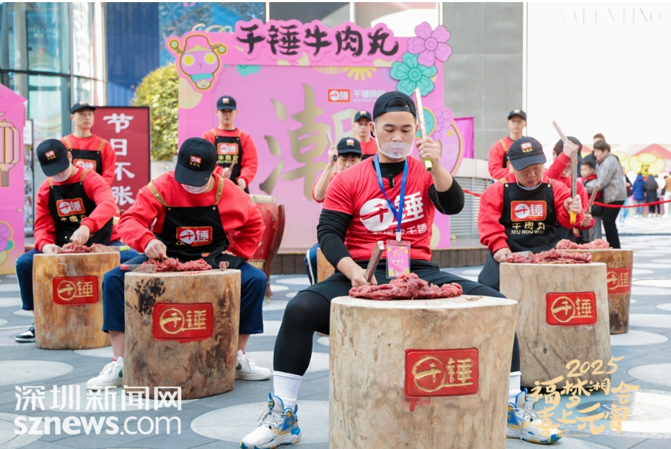 活动开场,来自福田区对口帮扶协作地区潮州的 “网红”——“千锤哥” 成为全场焦点。他在现场锤打新鲜牛肉超两百斤,手中双锤翻飞,将潮州牛肉丸制作绝技展现得淋漓尽致。每一次有力的锤击,都伴随着围观市民的阵阵惊叹。国家级黄连胜醒狮队的 4 头醒狮也前来助阵,上午 10 时,震天的锣鼓声响起,醒狮以矫健之姿跳跃步步高,狮头昂首腾挪,尽显狂野威猛,瞬间点燃了现场气氛。