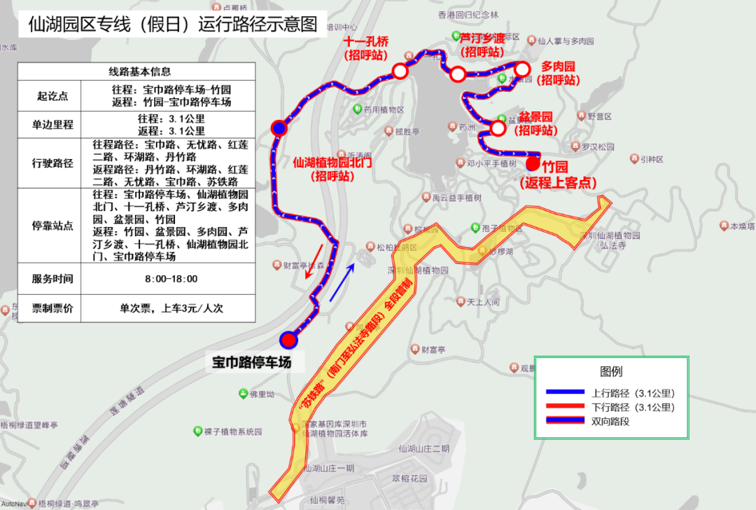 春节管控期间,仙湖植物园大门口(南门)立体停车库将暂停开放。入园进寺游客必须按照人行规划路线活动,路线全程步行约5公里,因排队等候等因素,全程用时约3小时,建议老幼、体弱以及行动不便的人士,尽量避免在春节期间前往仙湖植物园和弘法寺活动。