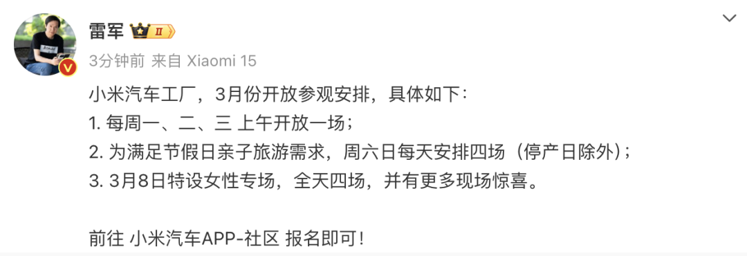 ●小米汽车工厂将在3月8日妇女节特设女性专场,全天4场,有现场惊喜。