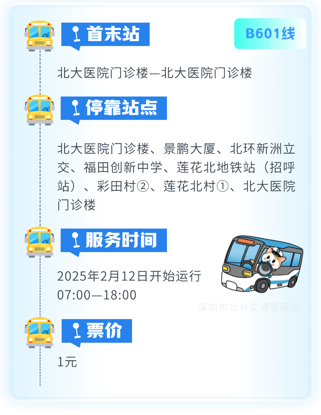 ● 福田:公交新线路开通!B601线于2月12日开通,该线路直达北大医院门诊楼。