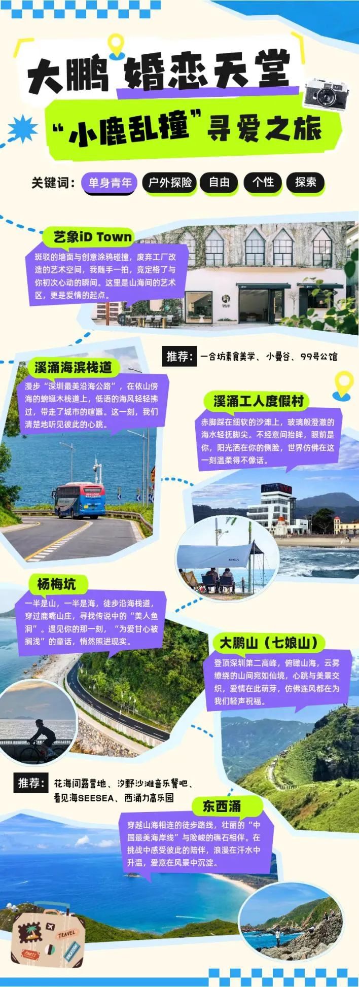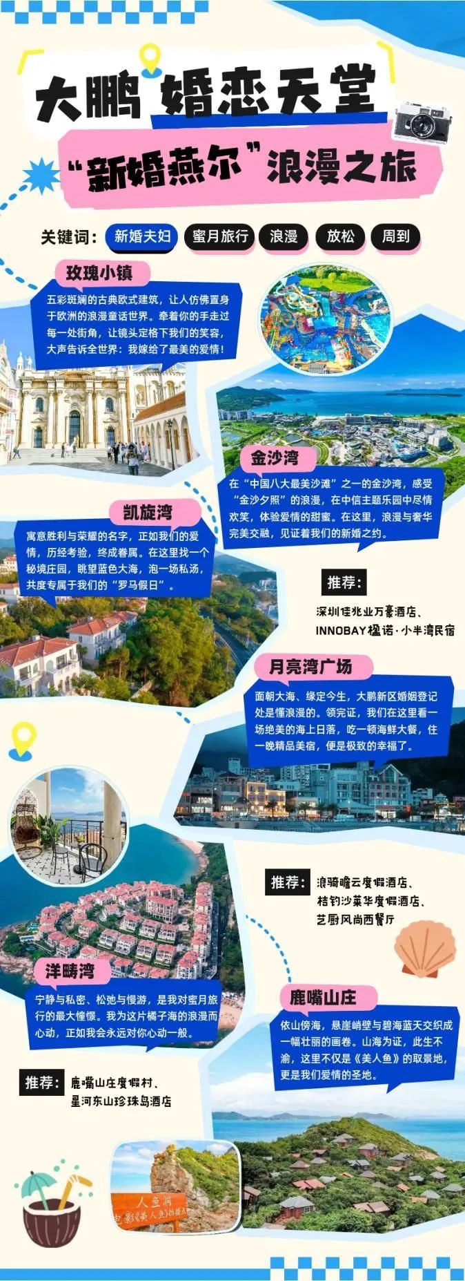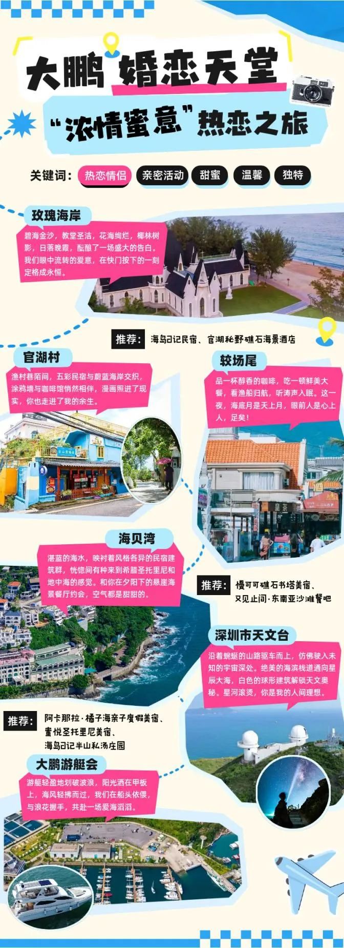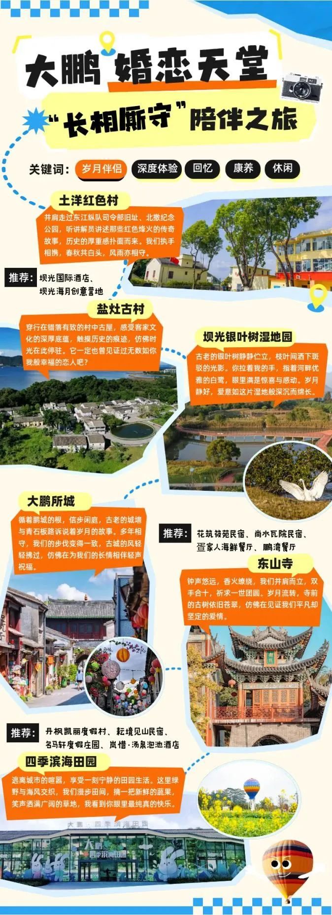 ● 大鹏:近日,大鹏“婚恋天堂”围绕单身、热恋、新婚、纪念等婚恋不同阶段的体验需求,推出4条主题路线。