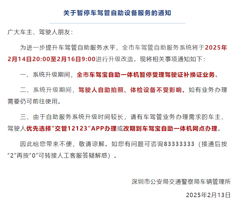 ●深圳车驾管自助服务系统将于2月14日20:00至2月16日9:00进行升级改造,系统升级期间,全市车驾宝自助一体机暂停受理驾驶证补换证业务。