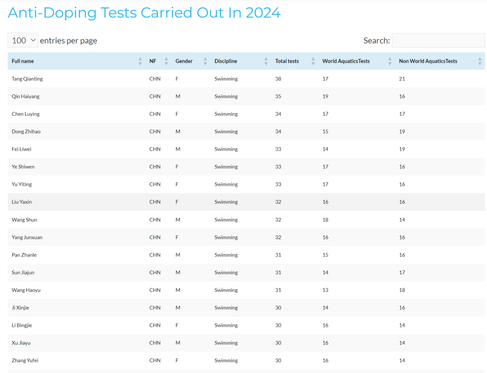 ● 世界泳联证实2024兴奋剂检测:接受检测最多的前32位全是中国选手。