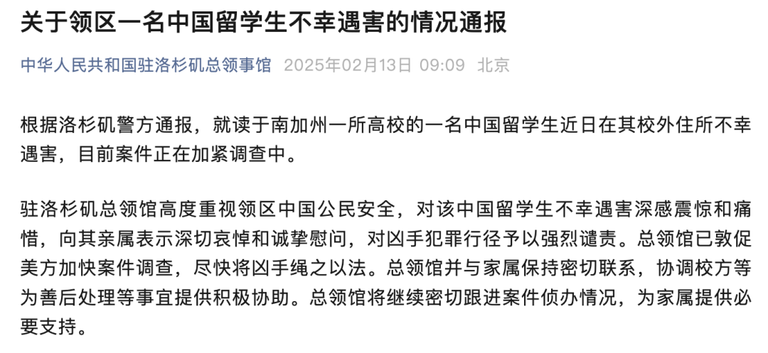 ● 一名中国留学生在美国不幸遇害,官方通报:目前案件正在加紧调查中。