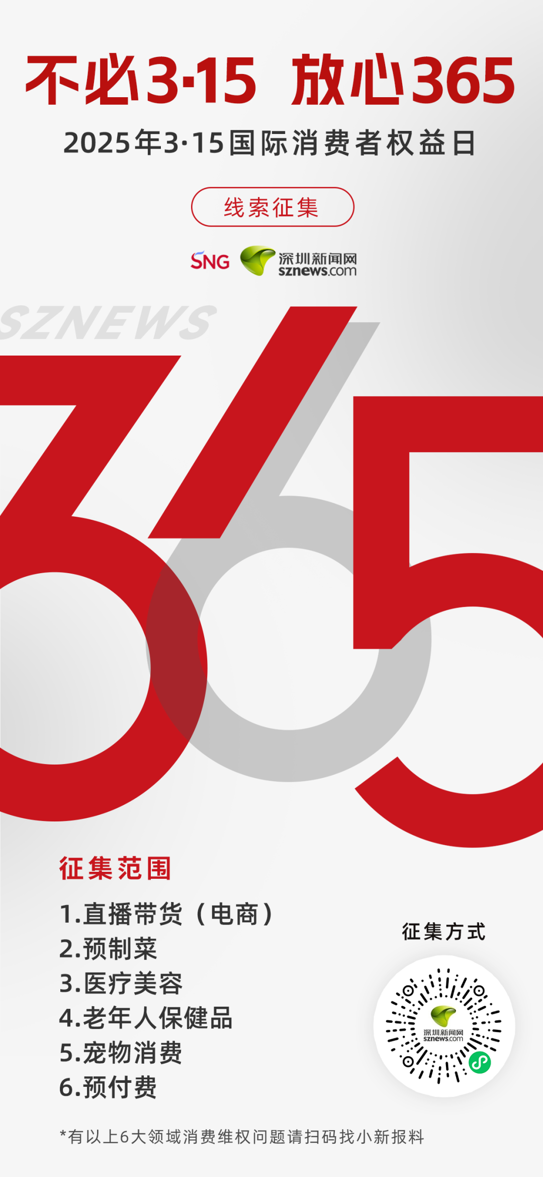 ●即日起,小新向全体消费者发出“3·15”线索征集令,涉及直播带货(电商)、预制菜、医疗美容、老年人保健品、宠物消费以及预付费,欢迎广大消费者报料。详情>>