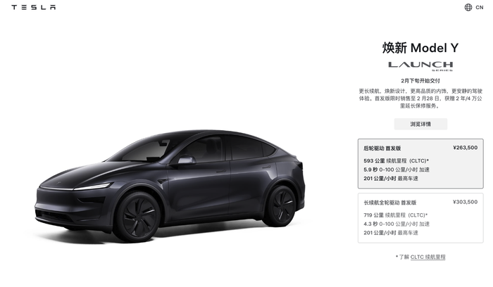 ● 2月18日,特斯拉中国官网显示,焕新版Model Y车型的交付时间现已更新,该车将于2月下旬开始交付。