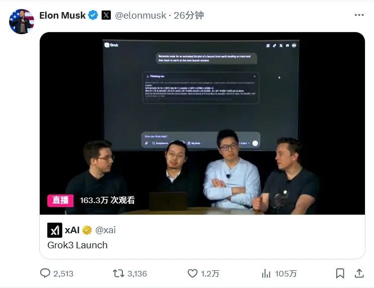 ●北京时间2月18日,被特斯拉创始人埃隆·马斯克称作“史上最聪明的AI”的最新大模型Grok 3亮相,并在直播中进行了现场演示。马斯克称Grok 3多项测试超过DeepSeek。详情>>
