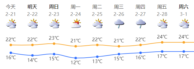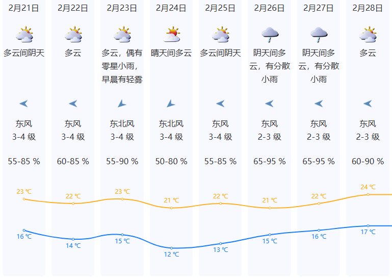 21日多云间阴天,气温16-23℃,沿海高地最大阵风6-7级;