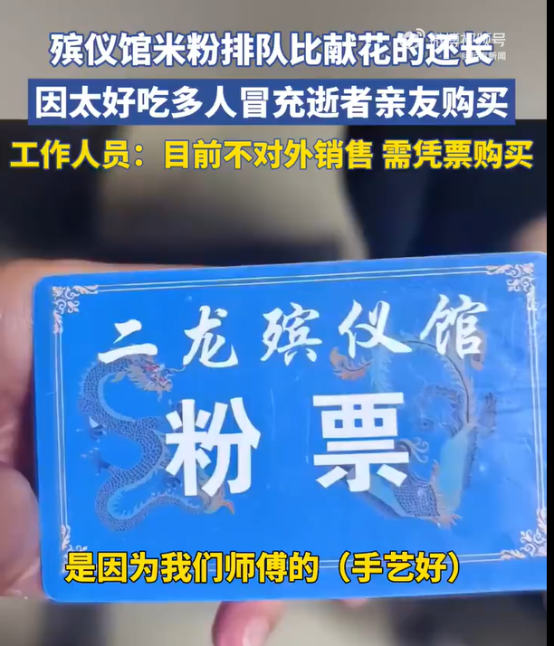 ●贵州一殡仪馆米粉好吃到排长队,有人冒充逝者亲友购买,工作人员:不对外销售,现需凭票购买。