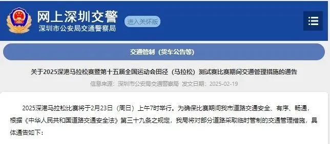 ● 南山:2025深港马拉松比赛暨第十五届全国运动会田径(马拉松)测试赛将于本周日(2月23日)举行,深圳交警将对部分道路实施临时管制措施。受赛事影响,深圳湾口岸预计关闭时间为2月23日2时至11时。