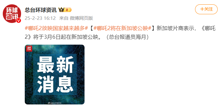 ●新加坡片商表示,《哪吒2》将于3月6日起在新加坡公映。
