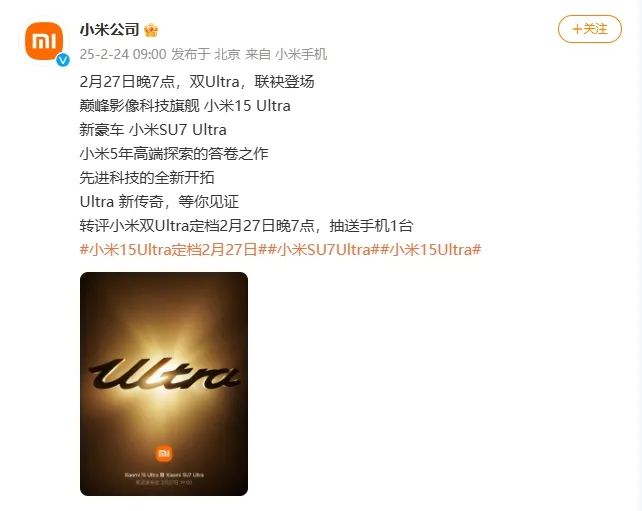● 据@小米公司 2月24日消息,小米15 Ultra、小米SU7 Ultra发布会定档2月27日晚7点。详情>>