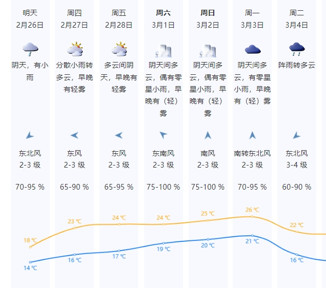 27日-3月3日,受暖湿气流影响,我市多云到阴天,间中有零星小雨,早晚有轻雾或雾,伴有回南天,气温逐日回升,天气温暖湿润;