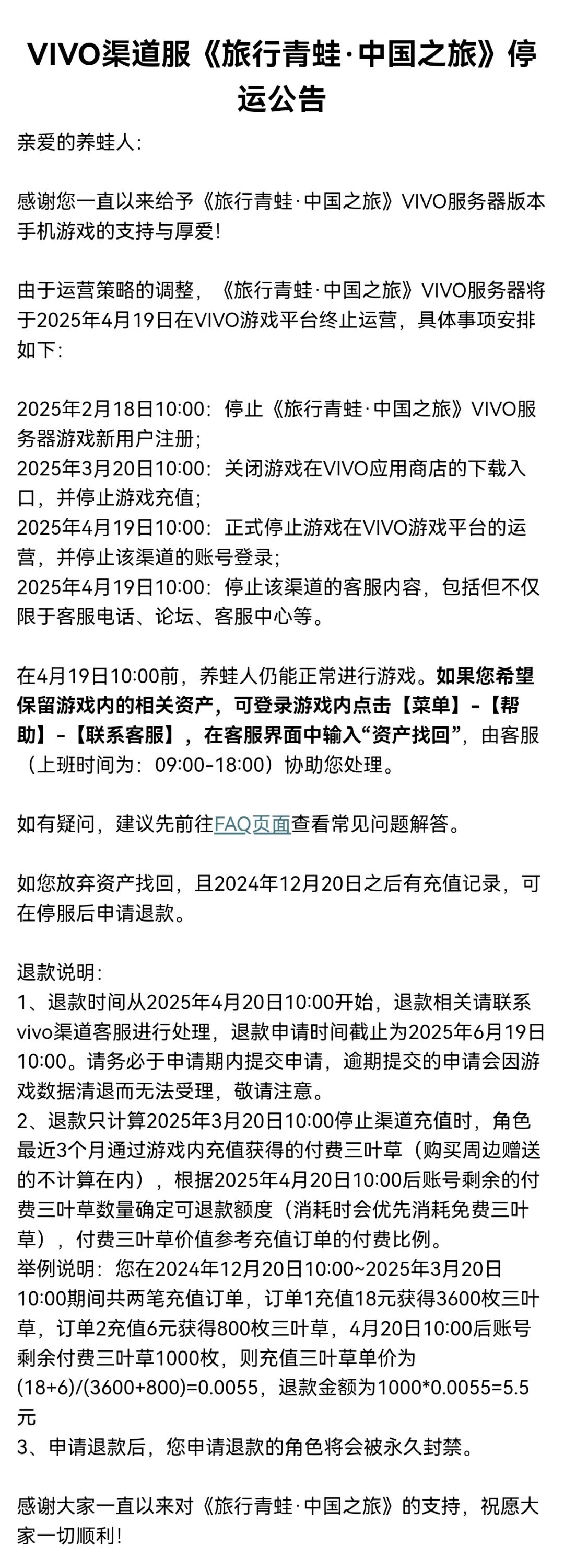 ● 《旅行青蛙·中国之旅》VIVO服务器将在4月19日终止运营,玩家可申请退款。详情>>