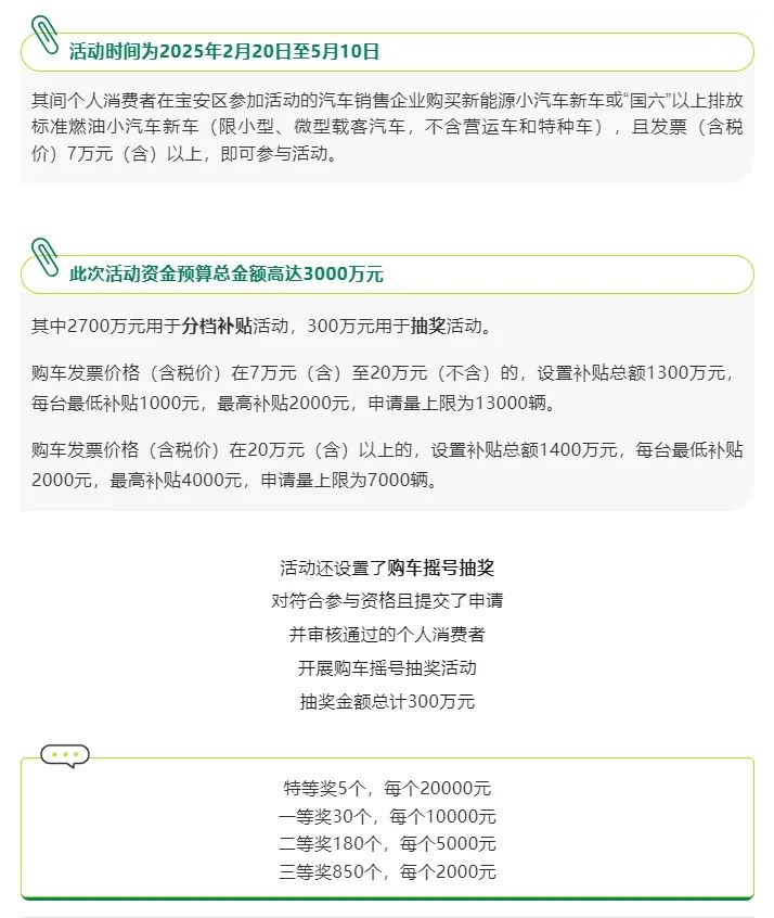 ●宝安:据悉,宝安区推出“欢购爱车”汽车促消费(第一轮)活动,活动资金预算总金额高达3000万元,其中2700万元用于分档补贴活动,300万元用于抽奖活动。