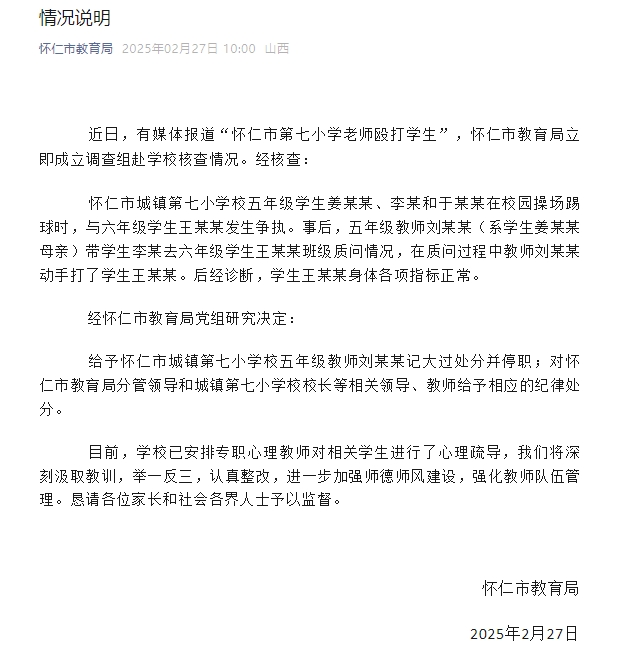 怀仁市教育局2月27日发布情况说明,近日,有媒体报道“怀仁市第七小学老师殴打学生”,怀仁市教育局立即成立调查组赴学校核查情况。经核查: