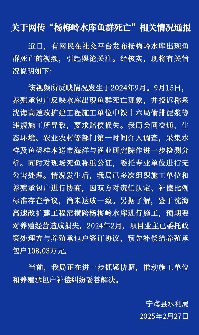 经核实,该视频所反映情况发生于2024年9月。9月15日,养殖承包户反映水库出现鱼群死亡现象,并投诉称系沈海高速改扩建工程施工单位中铁十六局偷排泥浆等违规施工所导致,要求赔偿损失。宁海县水利局会同交通、生态环境、农业农村等部门第一时间介入调查,采集水样及鱼类样本送市海洋与渔业研究院作进一步检测分析。同时对现场死鱼称重公证,委托专业单位进行无公害处理。情况发生后,宁海县水利局已多次组织施工单位和养殖承包户进行协商,因双方对责任认定、补偿比例标准存在争议,尚未达成一致。另据了解,鉴于沈海高速改扩建工程需横跨杨梅岭水库进行施工,预期要对养殖经营造成损失,2024年2月,项目业主已委托政策处理方与养殖承包户签订协议,预先补偿给养殖承包户108.03万元。