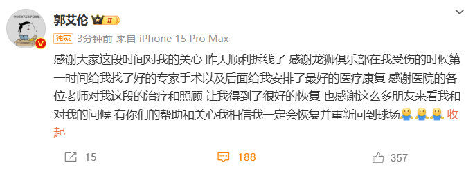 ● 3月5日,知名篮球运动员@郭艾伦发文报平安:“感谢大家这段时间对我的关心,昨天顺利拆线了。”