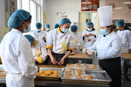 2024年12月17日,青海省海南藏族自治州职业技术学校烹饪专业教师黄雪妍(前右)在指导学生学习西点烘焙。近年来,青海省海南藏族自治州加大职业技术人才培养力度,开设藏医药、汽车维修、烹饪等专业,通过推进学校与企业联合办学,创新校企合作、定向培养等办学模式,拓宽职业教育毕业生就业渠道。