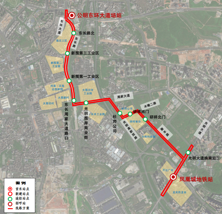 ·该线停靠站点:公明东环大道场站、东长路北、新围第三工业区、新围第一工业区、光明围岸商业街、杜邦公司、研祥西门、研祥北门、凤凰城地铁站、凤凰城地铁站、光明大道换乘站①、研祥北门、研祥西门、杜邦公司、光明围岸商业街、东长周家大道路口、新围第一工业区、新围第三工业区、东长路北、公明东环大道场站
