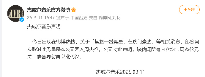 ● 3月11日,网传“超一线男星澳门赌博输20亿”,“周杰伦 澳门”引发热议。当日中午,周杰伦在社交平台晒出比耶录音照,并配文:“Work hard Play hard”。随后,公司发布声明辟谣。详情>>