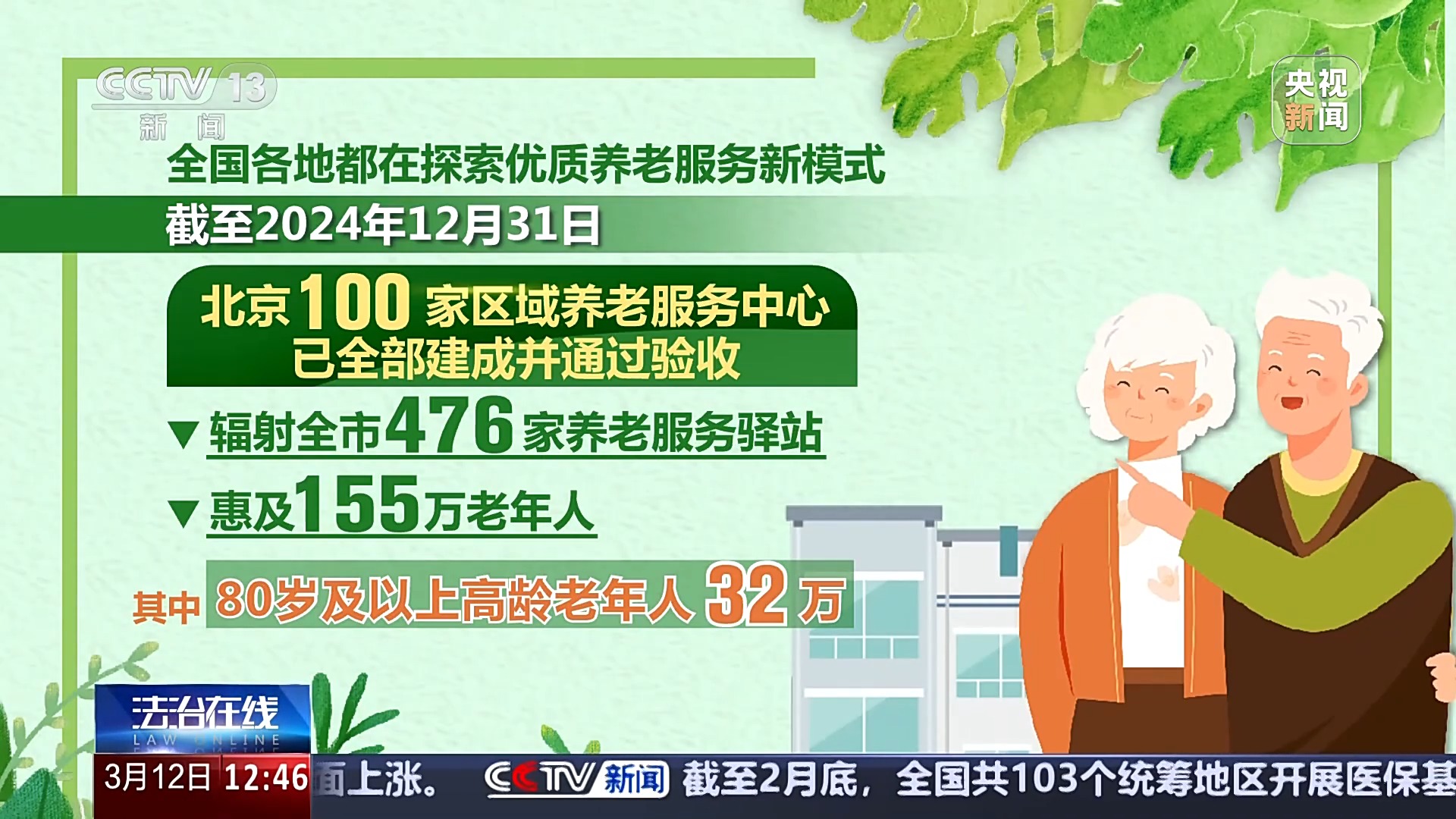 截至2024年12月31日,北京100家区域养老服务中心已全部建成并通过验收,辐射全市476家养老服务驿站,惠及155万老年人,其中80岁及以上高龄老年人32万。2025年,北京还将继续建设50家这样的区域养老服务中心,具备集中养老、康养娱乐等服务功能。