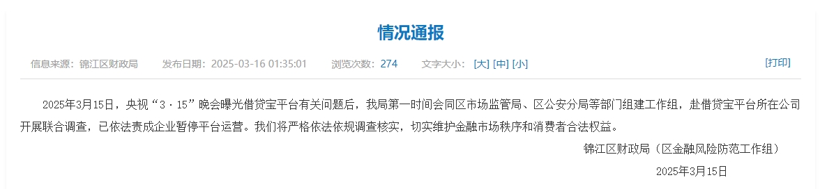 央视网消息:据四川成都锦江区政府网站消息,成都锦江区财政局发布情况通报,央视“3·15”晚会曝光借贷宝平台有关问题后,该局第一时间会同区市场监管局、区公安分局等部门组建工作组,赴借贷宝平台所在公司开展联合调查,已依法责成企业暂停平台运营。有关部门将严格依法依规调查核实,切实维护金融市场秩序和消费者合法权益。