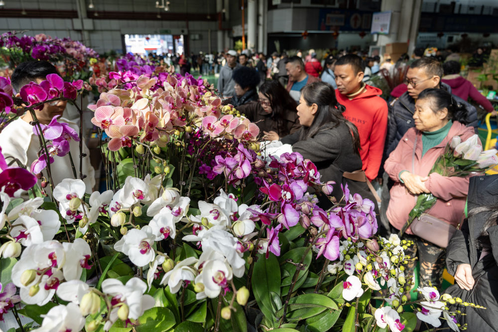 这是2025年1月22日拍摄的云南昆明斗南花卉市场一楼交易大厅,市民和游客在选购鲜花。新华社记者 陈欣波 摄