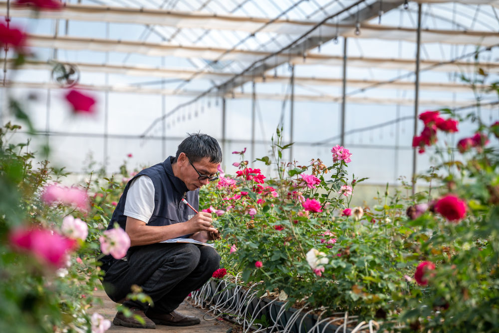 2023年10月20日,在云南省安宁市现代农业园区玫瑰种植示范园,技术员田连通在记录太空育种玫瑰花编号。