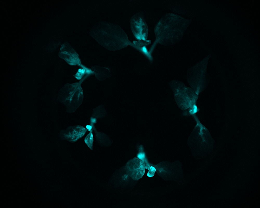 这是云南某农业研发团队利用基因技术成功培育出肉眼可见的“自发光植物”在黑暗条件下发光(2017年6月21日摄)。