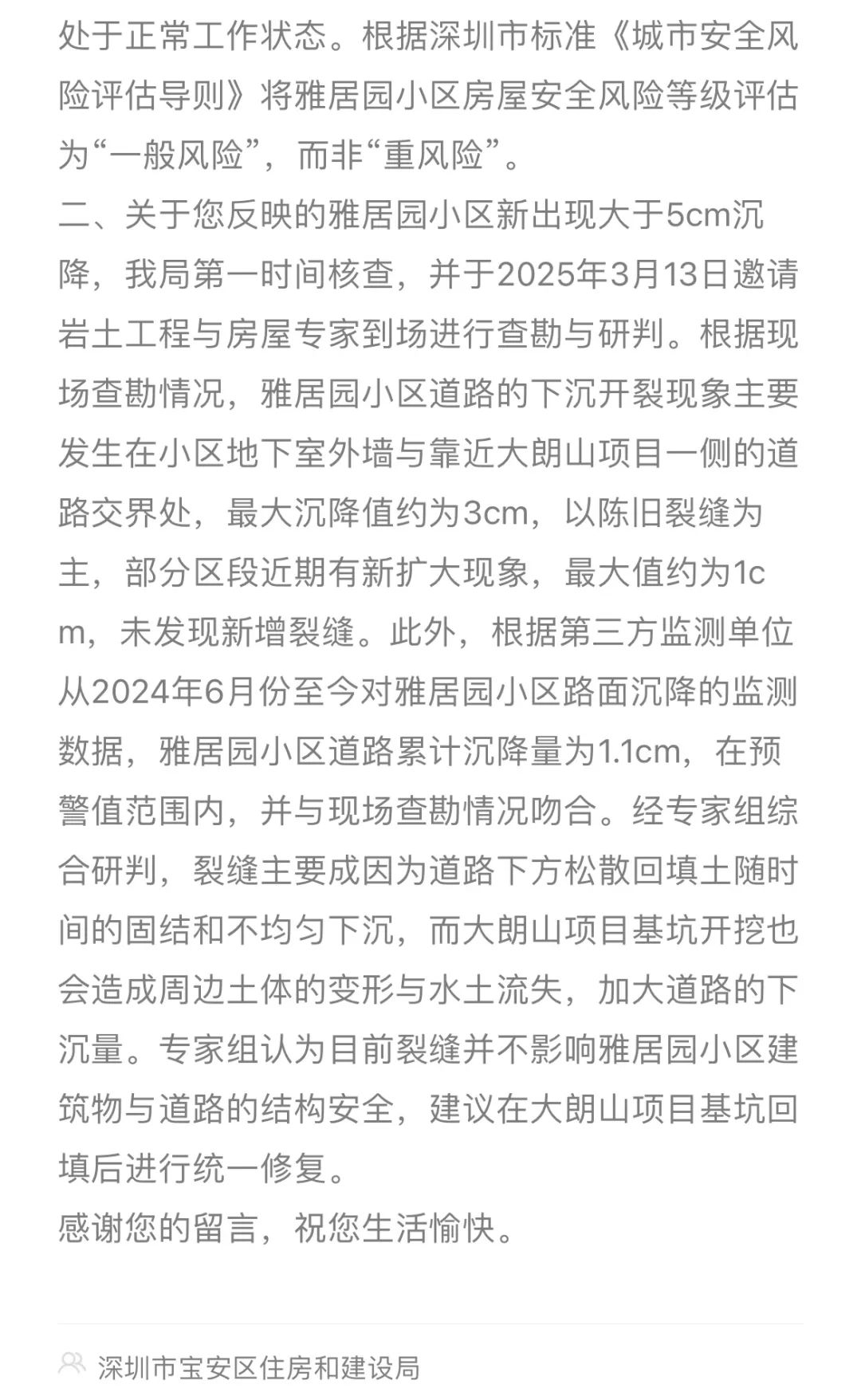 二、关于居民反映的雅居园小区新出现大于5cm的沉降,深圳市宝安区住房和建设局第一时间核查,并于2025年3月13日邀请岩土工程与房屋专家到场进行查勘与研判。根据现场查勘情况,雅居园小区道路的下沉开裂现象主要发生在小区地下室外墙与靠近大朗山项目一侧的道路交界处,最大沉降值约为3cm,以陈旧裂缝为主,部分区段近期有新扩大现象,最大值约为1cm,未发现新增裂缝。