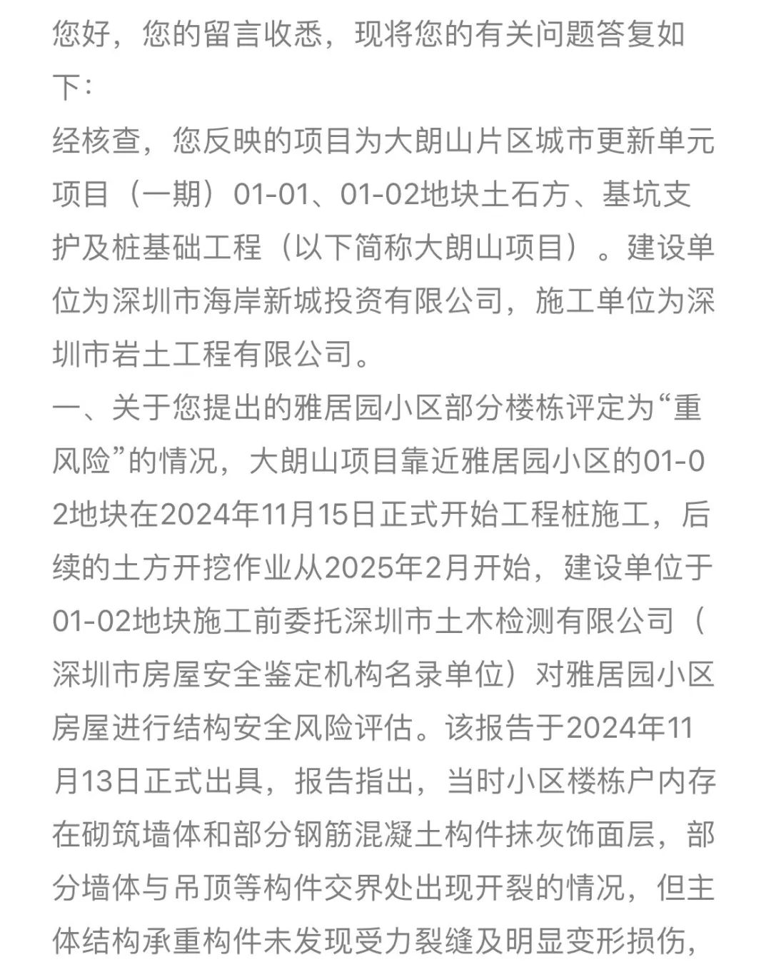 一、关于居民提出的雅居园小区楼栋于2024年11月“被评定为一般风险”的情况,大朗山项目靠近雅居园小区的01-02地块在2024年11月15日正式开始工程桩施工,后续的土方开挖作业从2025年2月开始,该次风险评定为建设单位于01-02地块施工前委托深圳市土木检测有限公司(深圳市房屋安全鉴定机构名录单位)对雅居园小区房屋进行结构安全风险评估后所出具的报告结论,属于施工前的房屋现状调查。