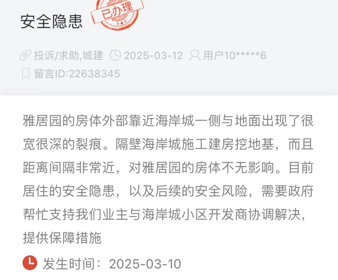 一市民在帖文中提到,“2024年11月,因地块施工导致(雅居园小区楼体出现)多处裂缝,部分楼栋已被评定为‘一般风险’。现如今雅居园新出现大于5cm沉降,申请介入监督并开展专业第三方评估,保障人民财产安全。”