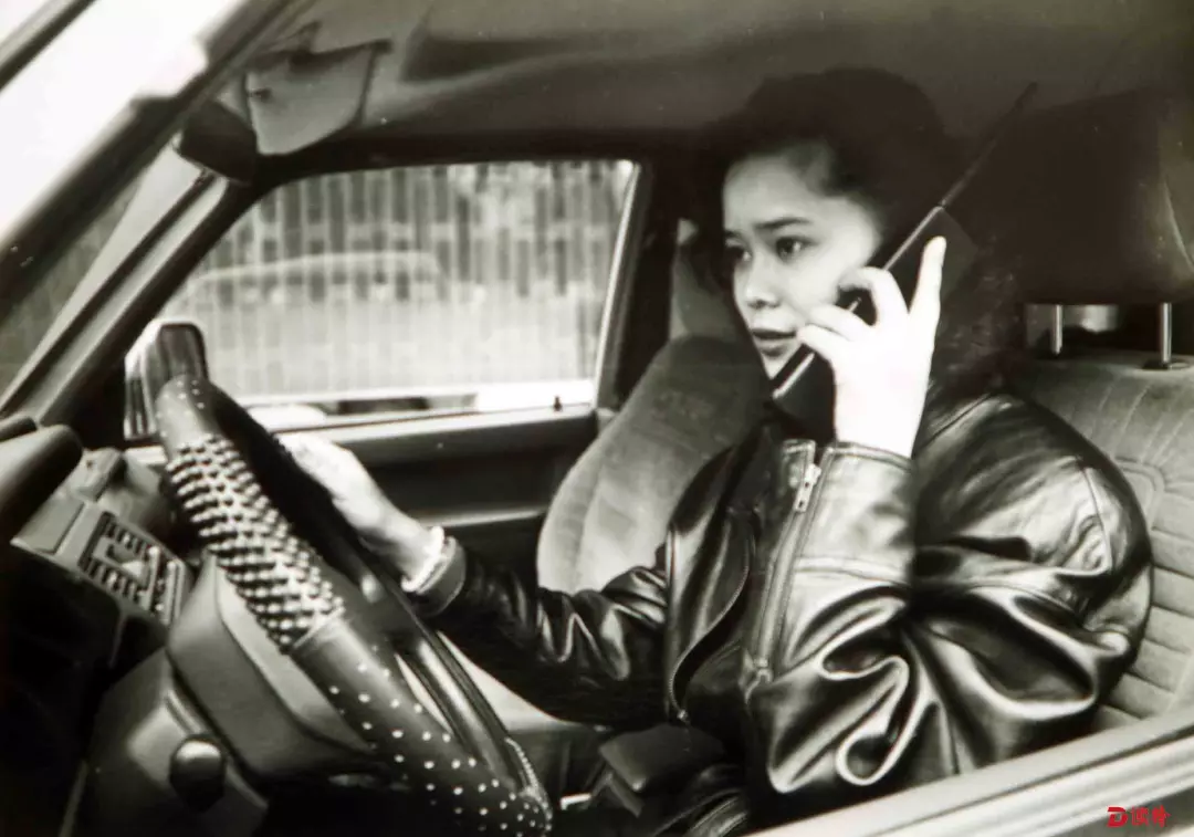 1989年,一边开车一边打大哥大电话的时髦女青年。