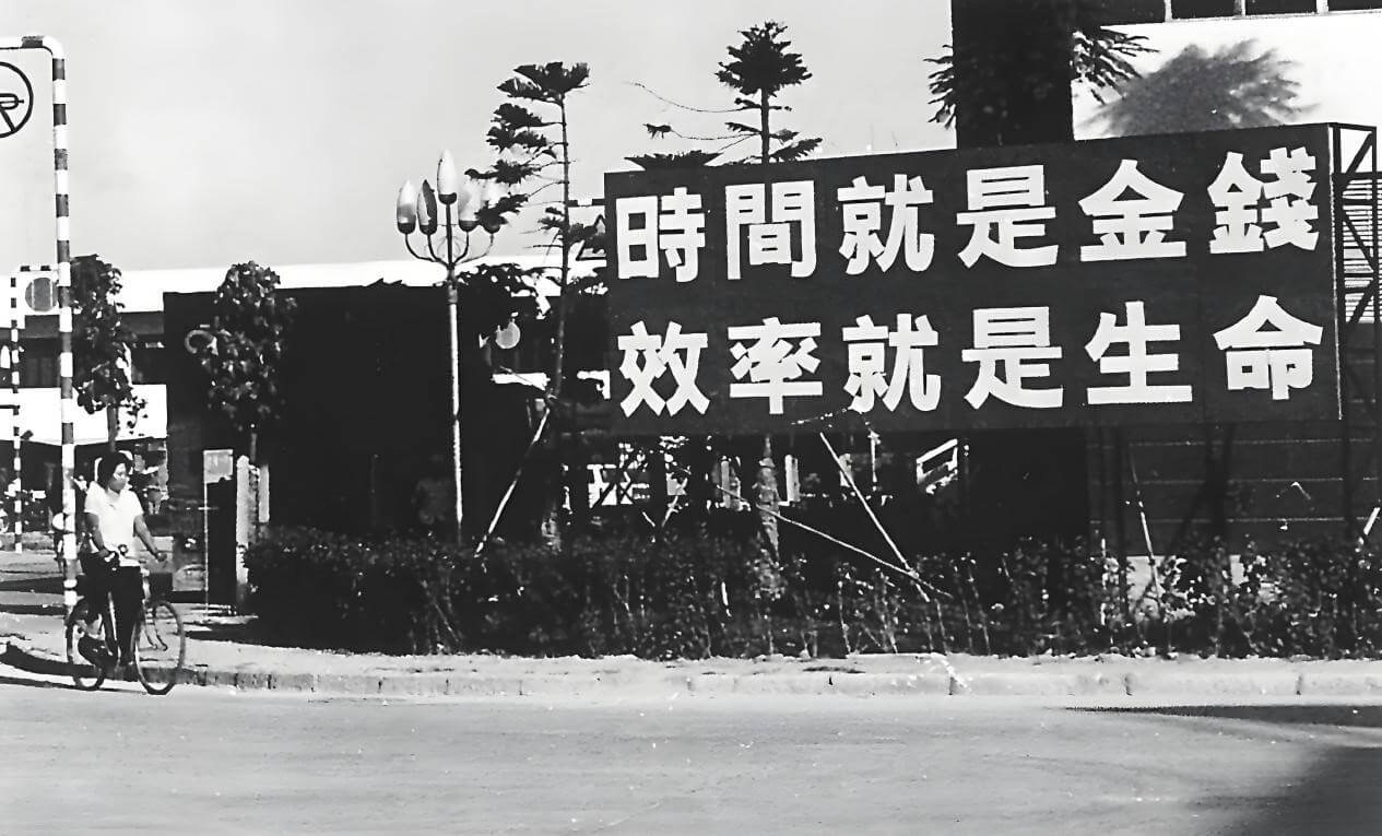 1986年,行人从张贴着醒目标语的蛇口工业区办公楼外骑车经过。