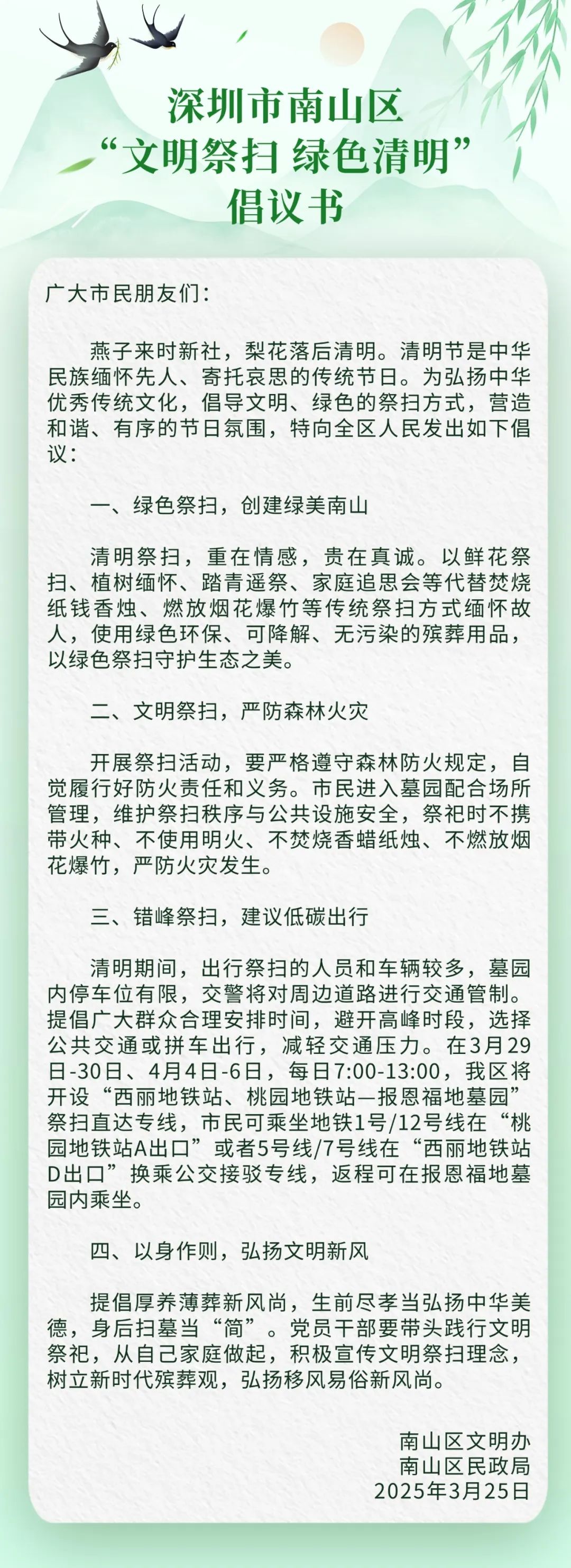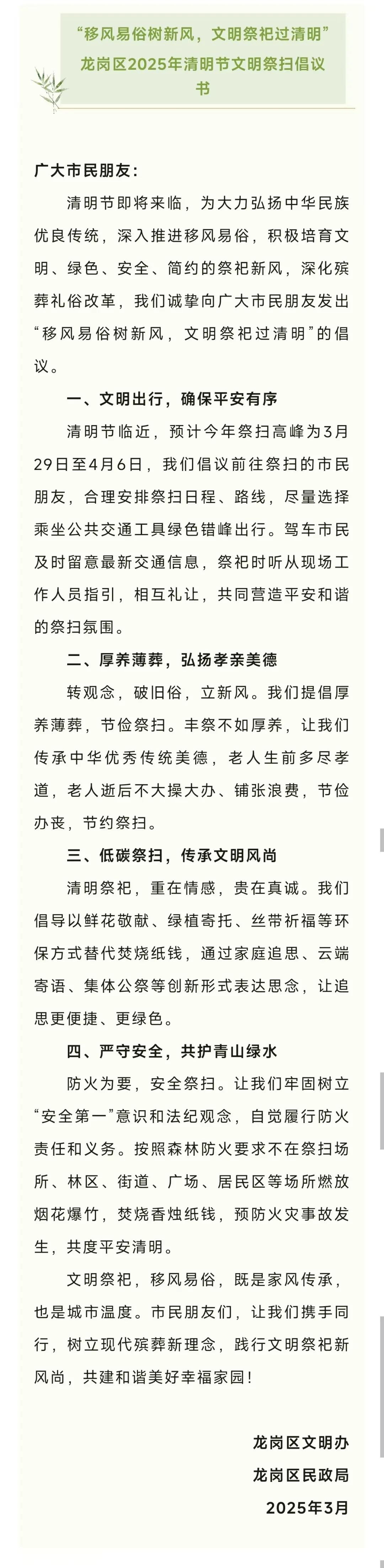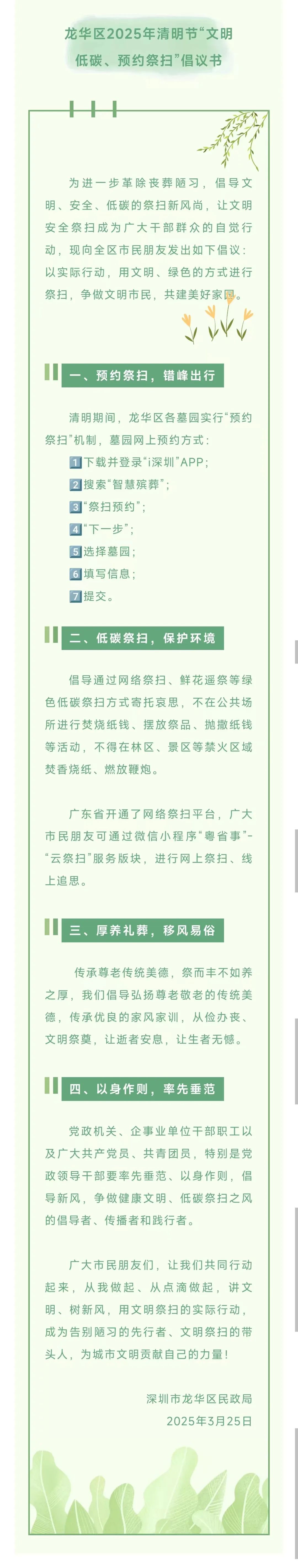 ●近日,深圳各区发起“文明祭扫 绿色清明”倡议书。