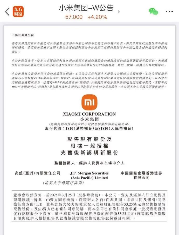 ● 3月25日,小米集团在港交所公告,拟配售8亿股现有股份,配售价为每股53.25港元,本次认购预计筹资净额约425亿港元,将用于业务扩张、研发投资及其他一般用途。
