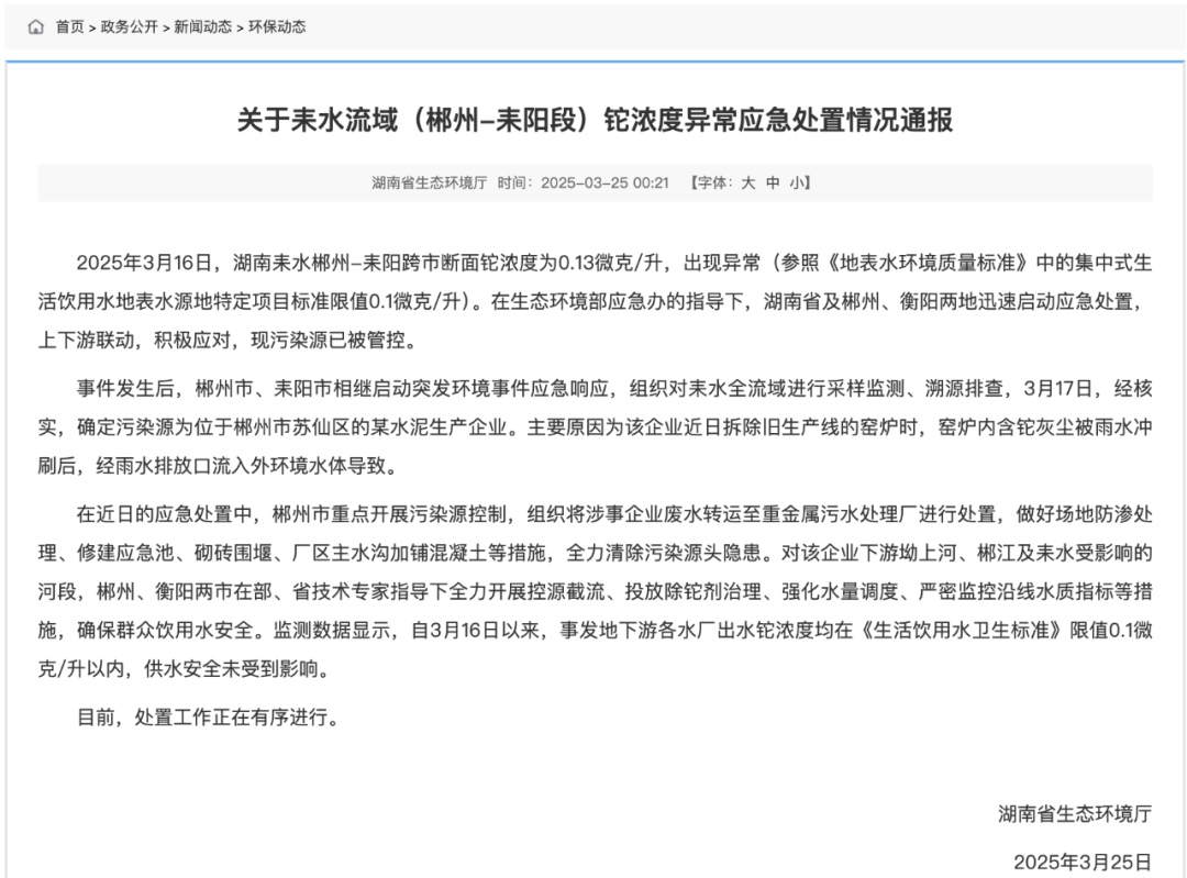 ● 3月25日,湖南省生态环境厅发布关于耒水流域(郴州-耒阳段)铊浓度异常应急处置情况通报。