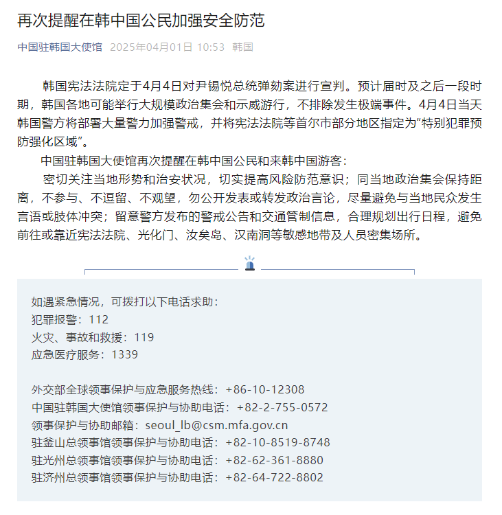● 4月1日,中国驻韩国大使馆再次提醒在韩中国公民加强安全防范。