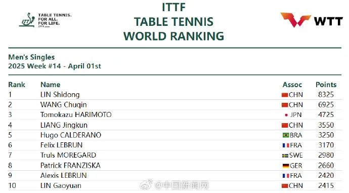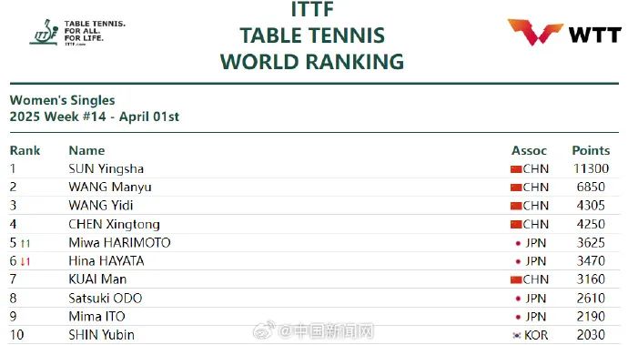 ● 2025国际乒联最新一期世界排名公布:男单方面林诗栋排名第一,女单方面孙颖莎排名第一。