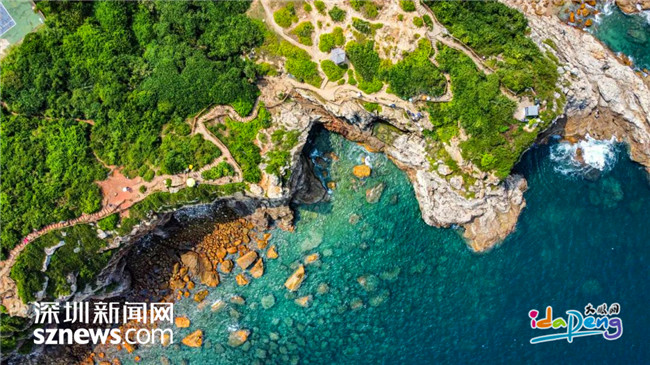 绿道全程紧贴海岸线,骑行时一路听涛观海,带来“最亲海的骑行体验”。出发时,可从观海平台遥望海贝湾,看海水清澈如“玻璃果冻”。还可以来打卡最近小红书上刷屏的“最美711”——711海贝湾店,它矗立在悬崖之上,面朝大海,橙绿色的招牌在碧海蓝天的映衬下格外醒目。在这里,来一份热腾腾的关东煮或车仔面,能量满满地出发!
