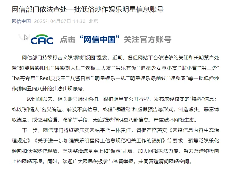 ●网信部门依法查处一批低俗炒作娱乐明星信息账号。详情>>