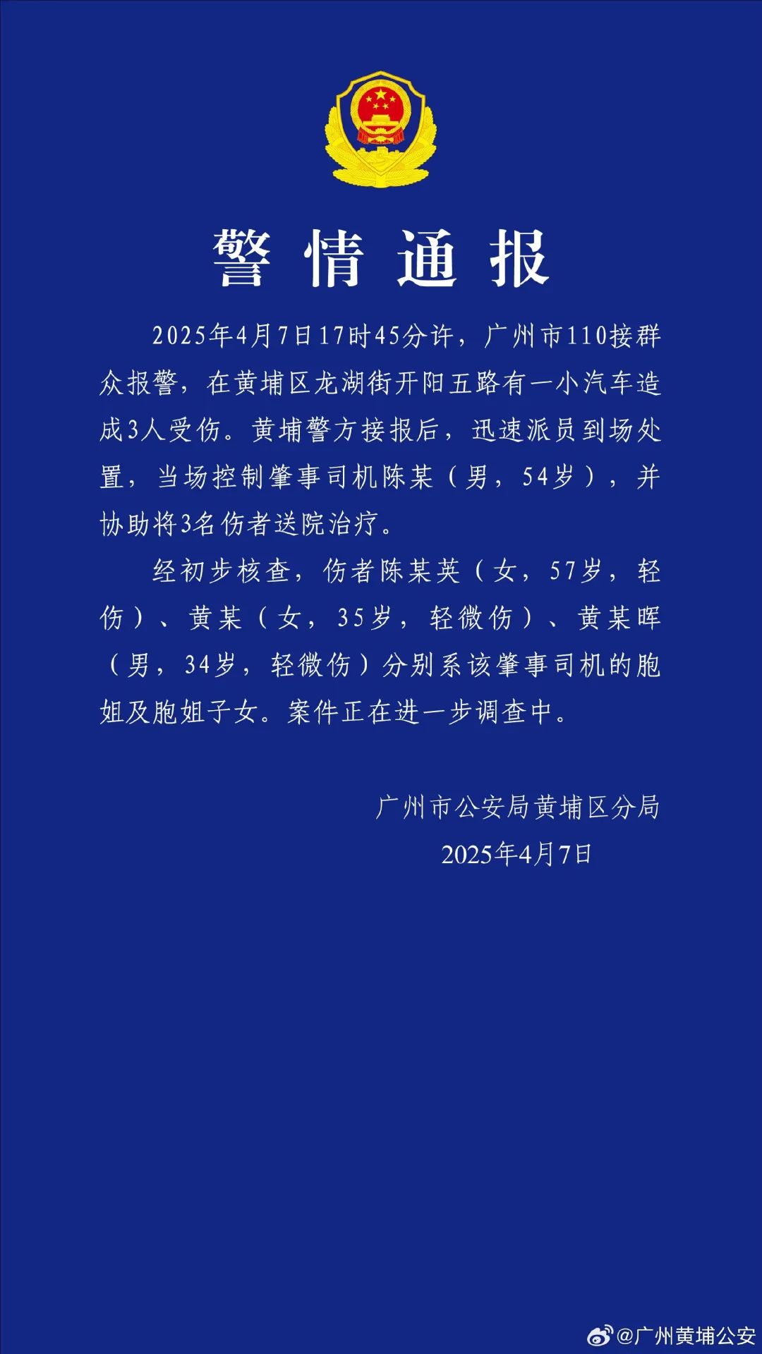 ●广州警方通报:男子驾车造成胞姐一家三口受伤,被当场控制。详情>>