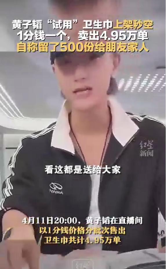 4月11日20:00,黄子韬@ACE-YOUNGKINGYOUNGBOSS 在直播间以1分钱价格分批次售出卫生巾共计4.95万单,卫生巾在不到一分钟的时间内被抢购一空。黄子韬在直播间中强调,4.95万单试用卫生巾是工厂的最终测试版本,主要为了获得大众对于该款卫生巾的真实反馈。黄子韬表示,该款卫生巾已通过17项国家检测,是一款医护级卫生巾。与此同时,黄子韬表示生产工厂采用24小时透明化的生产流程,后期消费者可以通过直播软件看到卫生巾生产的每个环节,保证生产流程无人接触,确保干净卫生。