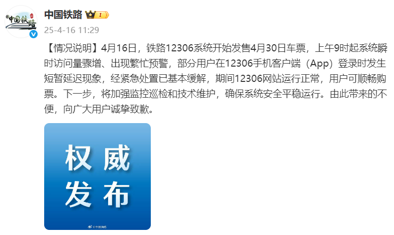 ● 12306就“五一抢票崩了”致歉:经紧急处置已基本缓解。详情>>
