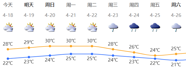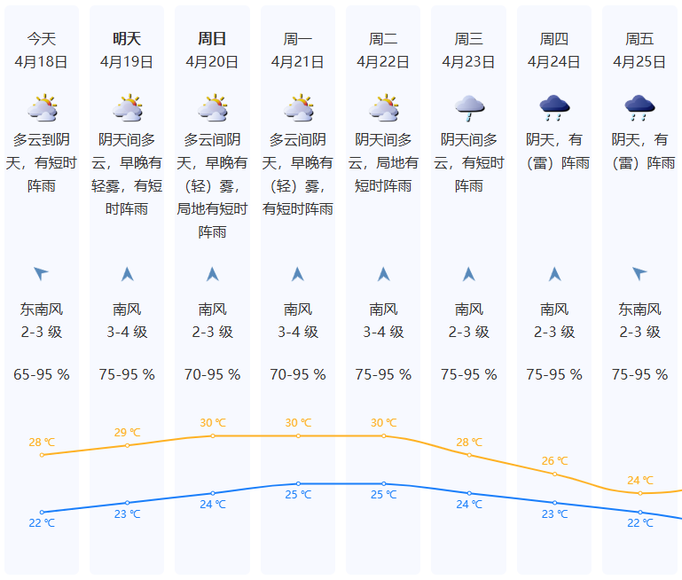 18日多云到阴天,有短时阵雨;气温22-28℃;东南风2-3级;相对湿度65%-95%。