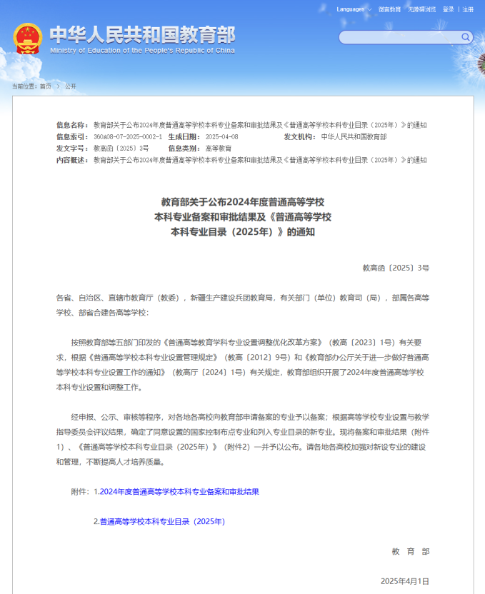 教育部同步更新发布《普通高等学校本科专业目录(2025年)》,增列29种新专业。新目录包含93个专业类、845种专业,进一步强化专业设置对国家战略急需和高质量发展的快速响应。
