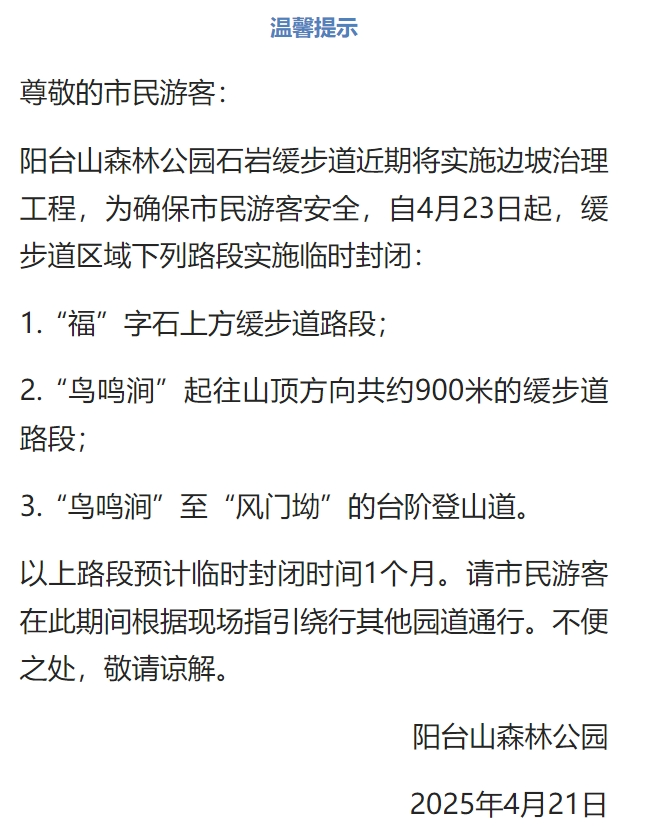 ● 自4月23日起,阳台山森林公园石岩缓步道部分路段临时封闭。